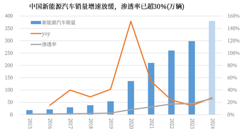 據(jù)中汽協(xié)數(shù)據(jù),2023全年中國新能源汽車車銷量達(dá)到949.5萬輛、同比+37.9%,較2021年(157.6%)和2022年(95.6%)增速大幅放緩,主要原因有二:2023全年和12月單月中國新能源汽車銷量滲透率達(dá)到31.6%和37.7%、年初至年末呈加速滲透,大基數(shù)和高增速下未來增長速率將回落;內(nèi)燃油車反撲性降價(jià)對(duì)新能源汽車銷量增長造成擠壓。