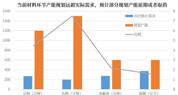 中游材料各環(huán)節(jié)新增產(chǎn)能推進(jìn)力度明顯減緩。行業(yè)研究報(bào)告數(shù)據(jù)顯示,2023Q1~3正極/負(fù)極/隔膜/電解液各環(huán)節(jié)上市公司構(gòu)建固定資產(chǎn)支付的現(xiàn)金的平均增速分別為-4.8%/-7.9%/+31.6%/+15.2%,較前兩年大幅降低。材料環(huán)節(jié)已公布產(chǎn)能規(guī)劃遠(yuǎn)超2025年全球需求。因此鋰電材料環(huán)節(jié)整體新增產(chǎn)能投放節(jié)奏或?qū)⒊掷m(xù)減緩,部分規(guī)劃產(chǎn)能將面臨延期或取消,其中電解液/隔膜環(huán)節(jié)相對(duì)格局更優(yōu)。