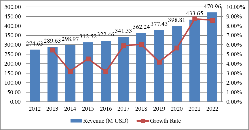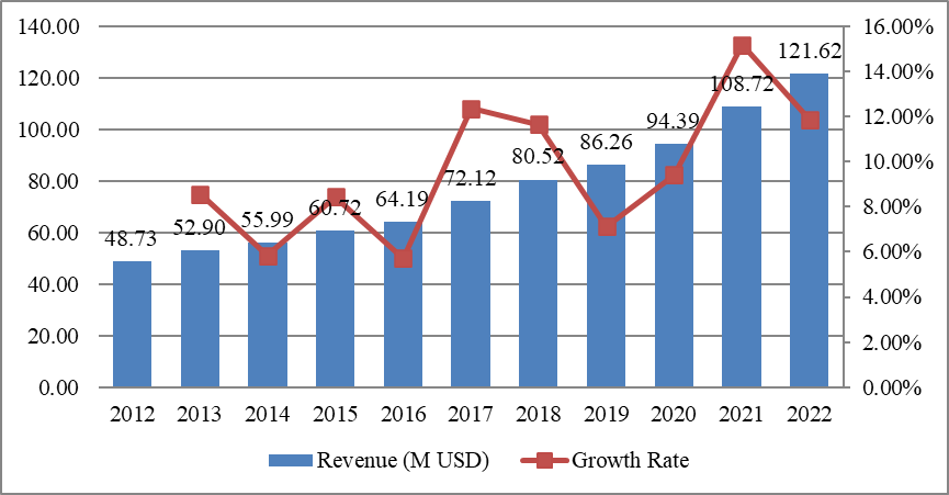圖亞太地區(qū)醫(yī)用聽診器收入(百萬美元)和增長率(%)(2012-2022年)