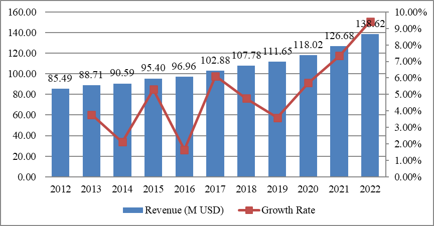圖歐洲醫(yī)用聽診器收入(百萬美元)和增長率(%)(2012-2022年)